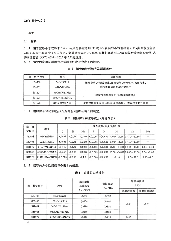 本標(biāo)準(zhǔn)規(guī)定了薄壁不銹鋼管 (以下簡(jiǎn)稱鋼管) 的標(biāo)記與標(biāo)志、尺寸與偏差、重量、要求、試驗(yàn)方法、檢驗(yàn)規(guī)則、包裝、運(yùn)輸和貯存及訂貨。本標(biāo)準(zhǔn)適用于公稱壓力不大于 1.6 MPa,公稱尺寸不大于 DN300,用于輸送生活用水 (冷水、熱水)、飲用凈水、醫(yī)用氣體、壓縮空氣、惰性氣體、燃?xì)?、燃油等薄壁不銹鋼管設(shè)計(jì)、制造和驗(yàn)收。